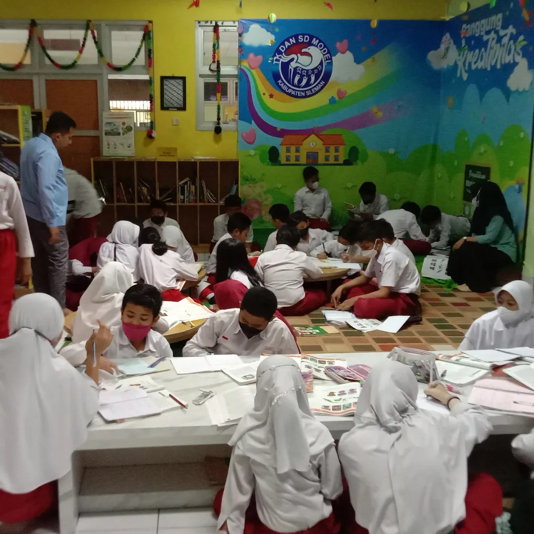 Para siswa kelas 5B bersama Guru kelas Bapak Irwan Andrayani S.Pd...melaksanakan pembelajaran "" Mencari arti kata sifat dari KBBI"" diPerpustakaan Mutiara Ilmu